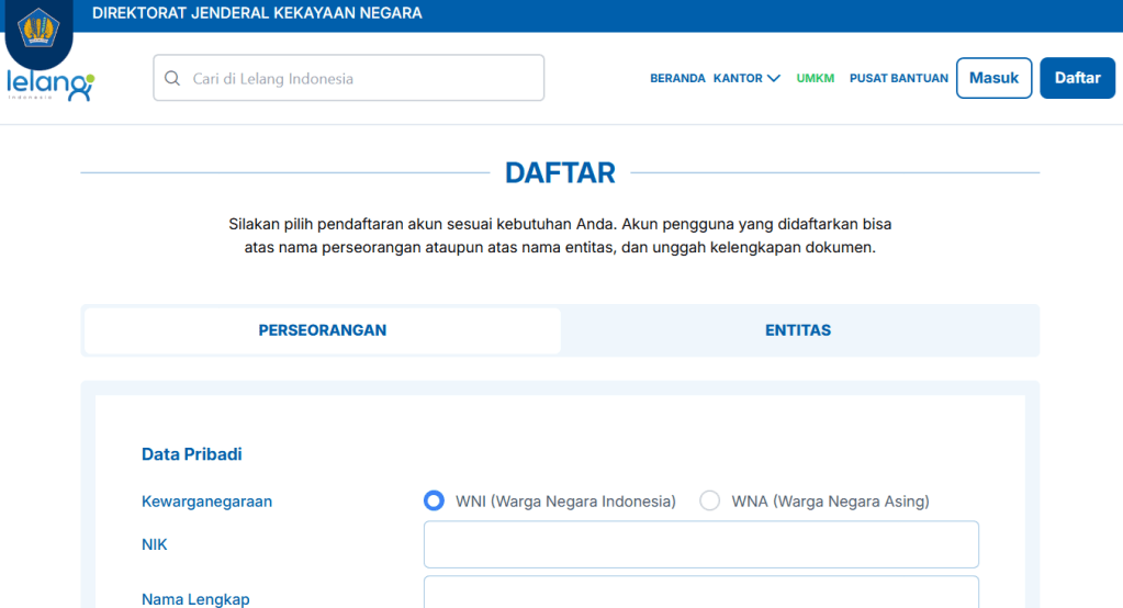 Anda merupakan peserta lelang PERORANGAN atau ENTITAS.